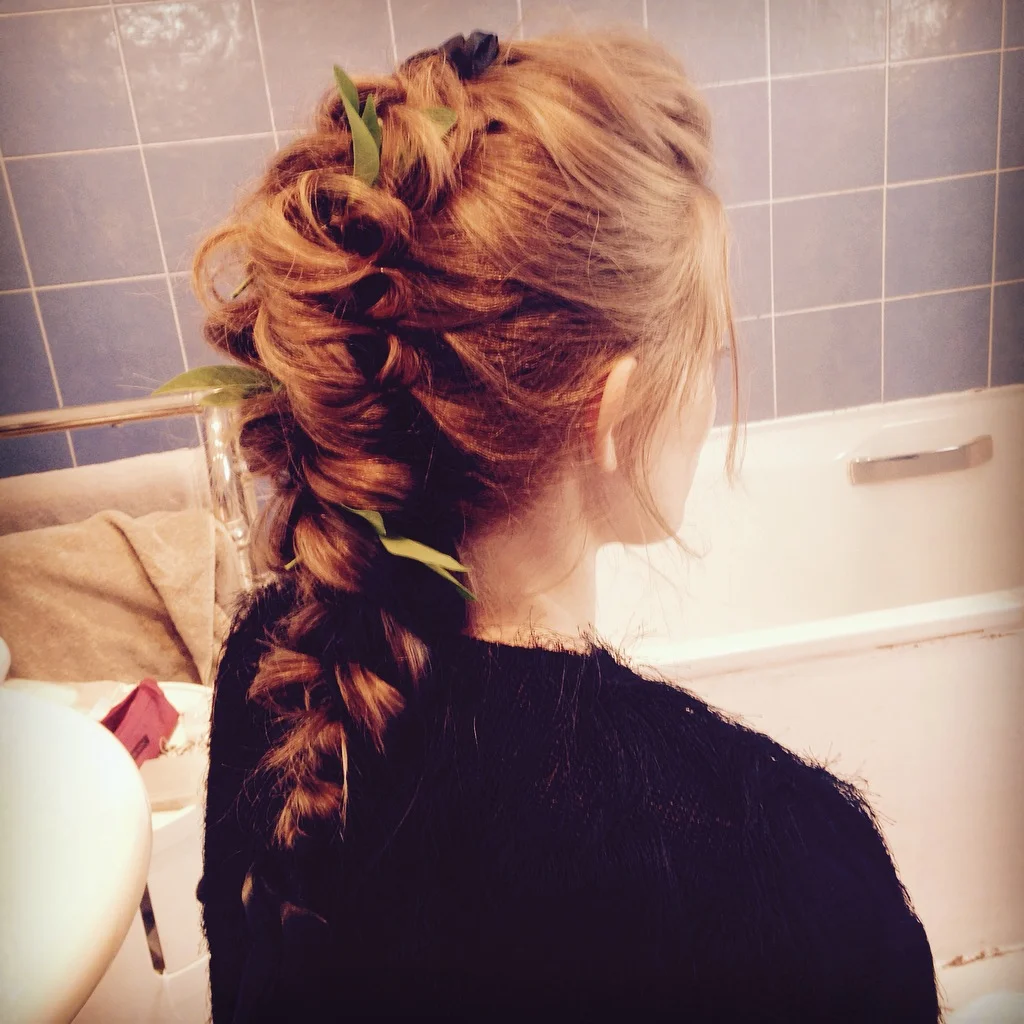I created this look by incorrporating Ribbon and leaves from the garden to tie in the whole theme. I started by braiding the hair then teasing out the whole look to create something loose and fairy tail looking.